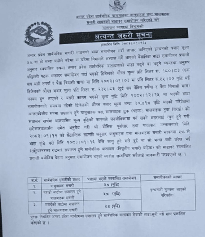 यातायात व्यवस्था विभागले देशभरका अन्तर–प्रदेश चल्ने सार्वजनिक यातायातको भाडा दरमा वृद्धि गरेको छ । विभागले २०८० वैशाख १६ गतेदेखि लागू हुने गरी यात्रुवाहक र मालवाहक दुवै प्रकारका सवारी साधनको भाडा बढाउने निर्णय गरेको हो ।