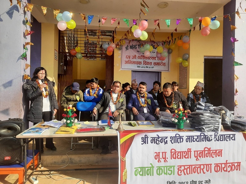 महेन्द्र शक्ति माध्यमिक विद्यालयको वार्षिकोत्सव समारोहलाई सम्बोधन गर्दै प्रमुख अतिथि एवं शिक्षा अधिकृत राजेन्द्र खनालले विद्यालयको शैक्षिक सुधारमा पूर्व विद्यार्थीहरूको योगदानको उच्च प्रशंसा गरे। आफूलाई सबल बनाउने र जीवनको जग निर्माण गर्ने विद्यालयलाई सम्झेर पूर्व विद्यार्थीहरूले गरेको न्यानो कपडा वितरण कार्य अत्यन्तै पवित्र र अनुकरणीय रहेको उनले बताए।आगामी दिनमा पनि विद्यालयको शैक्षिक र भौतिक विकासका लागि यस्तै सहकार्य जारी रहने विश्वास व्यक्त गर्दै उनले पुरस्कार विजेता विद्यार्थीहरूलाई बधाई तथा विद्यालयको निरन्तर प्रगतिको कामना गरे।