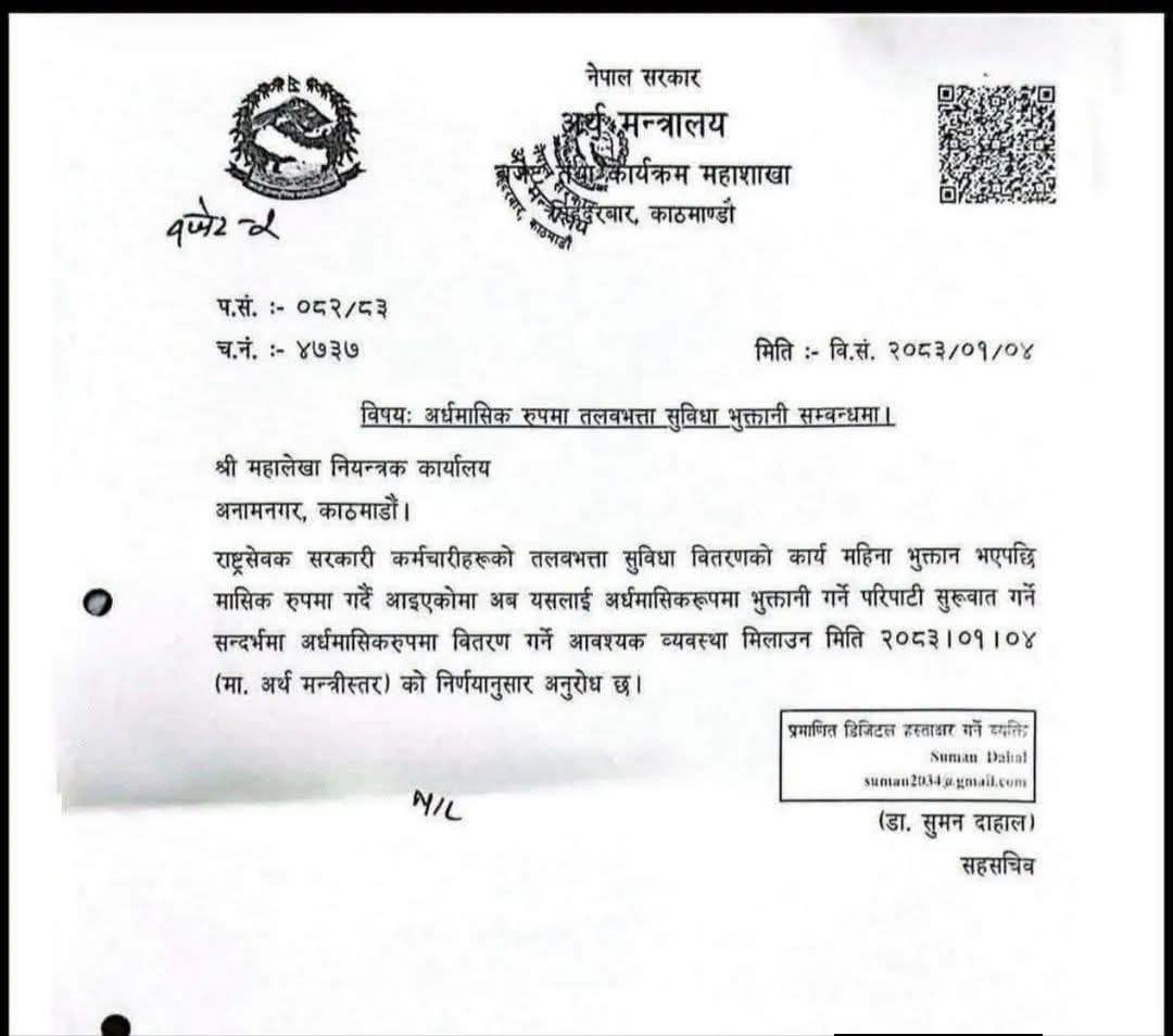 मन्त्रालयले महालेखा नियन्त्रक कार्यालय, अनामनगरलाई पत्र पठाउँदै अर्धमासिक रूपमा तलब वितरणका लागि आवश्यक प्राविधिक र प्रशासनिक व्यवस्था मिलाउन अनुरोध गरेको छ ।