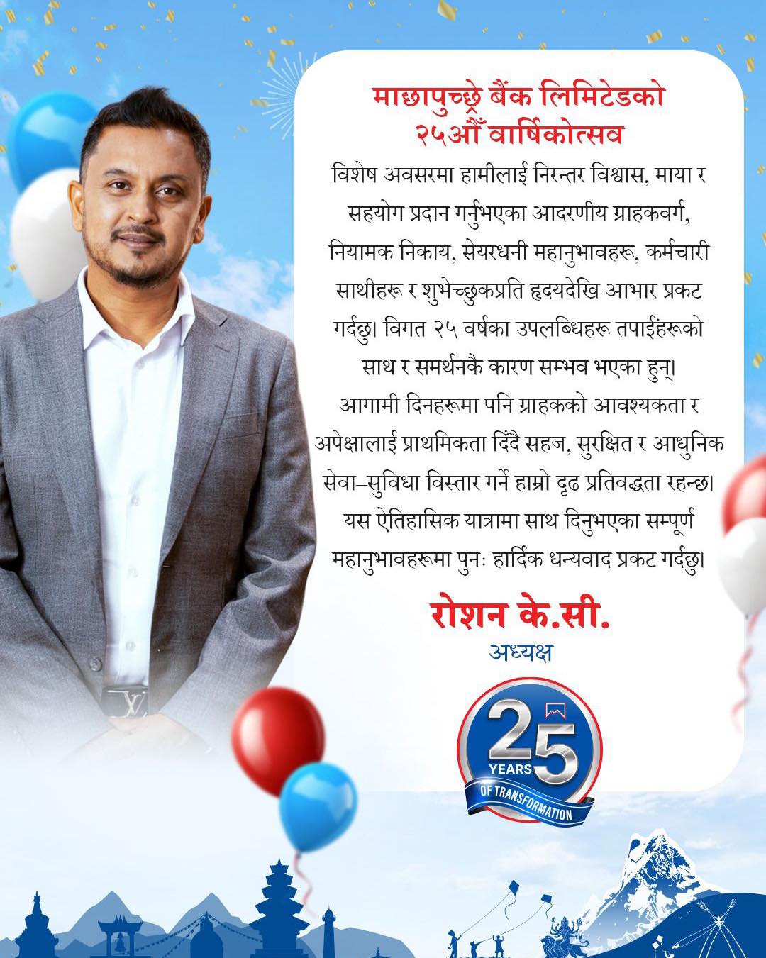 काठमाडौं। माछापुच्छ्रे बैंक लिमिटेडले आफ्नो २५औँ वार्षिकोत्सव विशेष कार्यक्रमका साथ मनाएको छ। बैंकले २५ वर्षको ऐतिहासिक यात्रामा साथ, माया र विश्वास प्रदान गर्ने ग्राहकवर्ग, सेयरधनी, नियामक निकाय, कर्मचारी तथा सम्पूर्ण शुभेच्छुकप्रति हार्दिक धन्यवाद प्रकट गरेको छ।