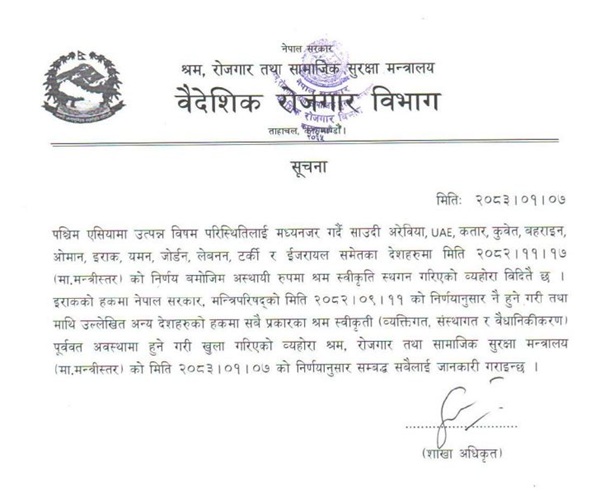 सरकारले संयुक्त अरब इमिरेट्स (यूएई) सहित खाडी तथा अन्य विभिन्न पश्चिम एसियाली मुलुकहरूका लागि स्थगित गरिएको श्रम स्वीकृति पुनः सुचारु गर्ने निर्णय गरेको छ।