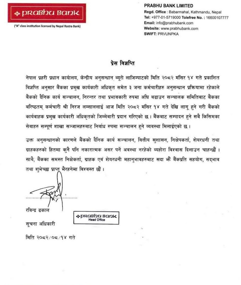 प्रभु बैंकले अनपेक्षित परिस्थितिमा पनि ग्राहक सेवा प्रभावित हुन नदिन आवश्यक कदम तत्काल उठाइएको बताउँदै कामु सीईओको जिम्मेवारी बहाल भएपछि बैंकको सम्पूर्ण कामकाज सहज ढङ्गले अघि बढ्ने विश्वास व्यक्त गरेको छ।