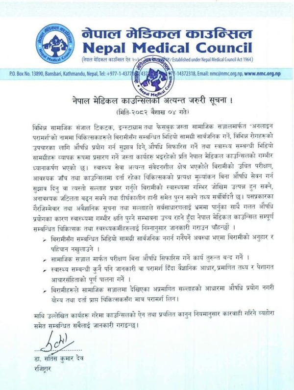 काउन्सिलले एक सूचना जारी गर्दै टिकटक, इन्स्टाग्राम र फेसबुक जस्ता प्लेटफर्ममा बिरामीका भिडियो सामग्री सार्वजनिक गर्ने र प्रत्यक्ष परीक्षण बिना औषधि सुझाव दिने कार्यप्रति गम्भीर ध्यानाकर्षण भएको जनाएको छ।