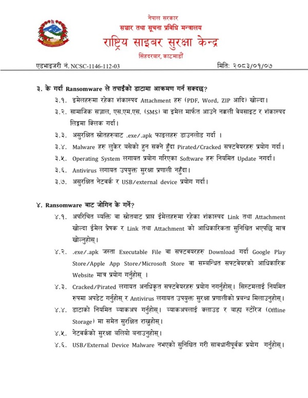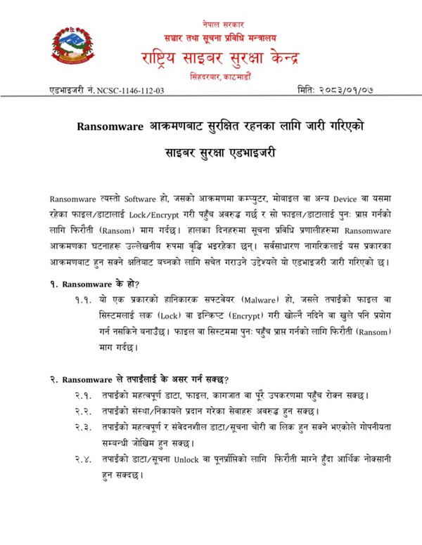 नेपालमा र्यान्समवेयर आक्रमण बढ्दो: राष्ट्रिय साइबर सुरक्षा केन्द्रले जारी गर्यो विशेष एडभाइजरी
