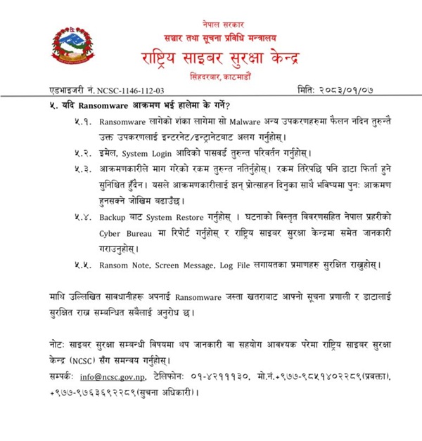 साथै, घटनाको विस्तृत जानकारी नेपाल प्रहरीको साइबर ब्युरो तथा राष्ट्रिय साइबर सुरक्षा केन्द्रमा उपलब्ध गराउन पनि आग्रह गरिएको छ।