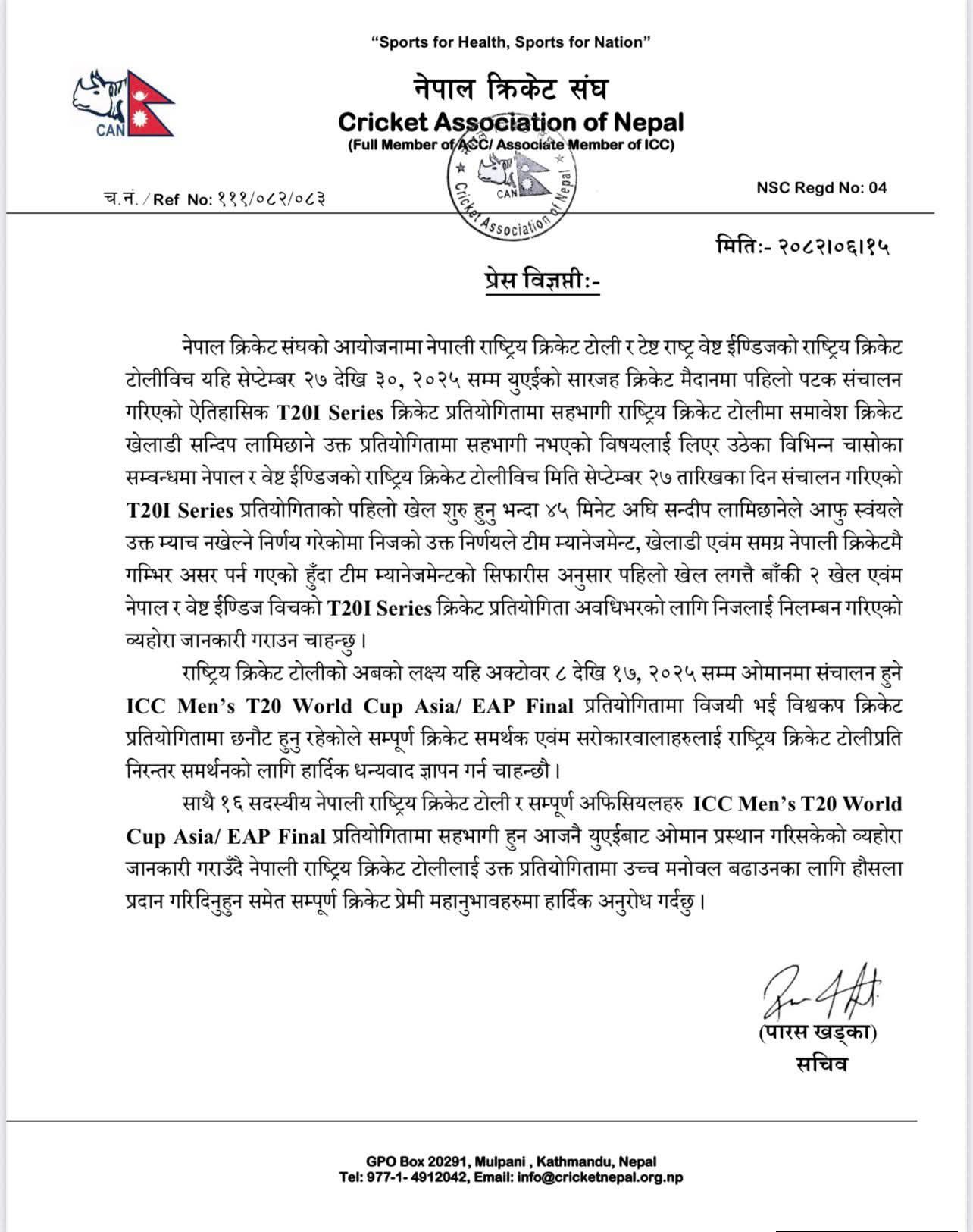 क्यानका सचिव पारस खड्काले जारी गरेको विज्ञप्तिमा सेप्टेम्बर २७ मा पहिलो खेल सुरु हुनुभन्दा करिब ४५ मिनेट अघि सन्दीपले आफैं नखेल्ने निर्णय गरेको र उनको उक्त निर्णयले टीम म्यानेजमेन्ट, खेलाडी एवंम समग्र नेपाली क्रिकेटमै गम्भिर असर पर्न गएको उल्लेख छ।